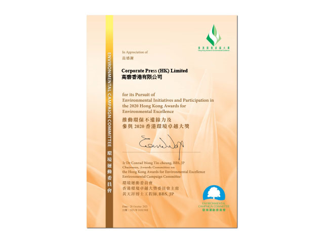 高碧香港有限公司於2020年獲得香港環境卓越大獎之參與證書。該證書確立了高碧香港在追求環境倡議和參與 HKAEE/HKGIA/OGACS 方面所做的努力。